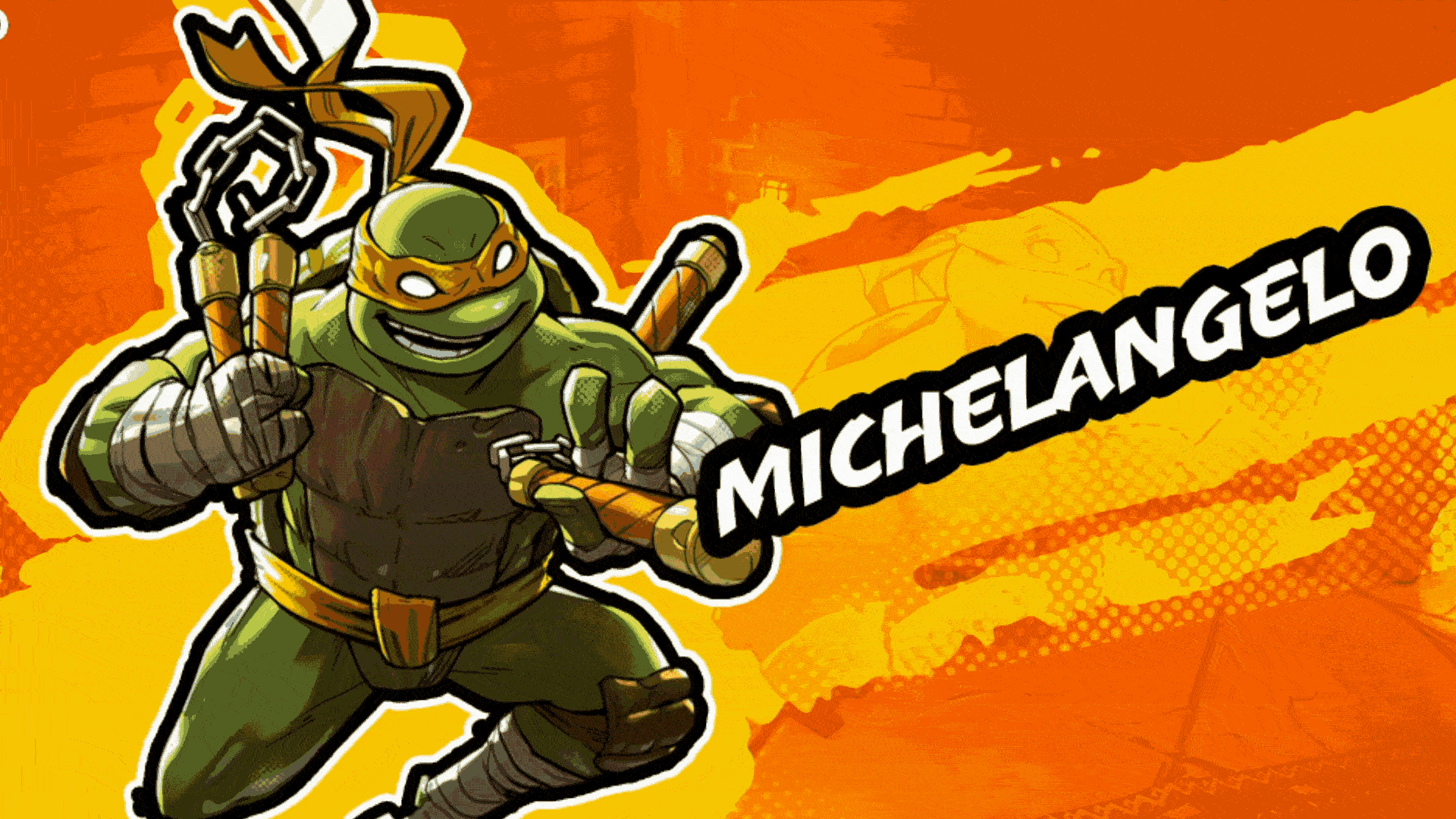 Michelangelo's text slate evolved through multiple versions, initially taking on a comic book feel with bold outlines and saturated colors. It was later refined to align better with the other slates, with key updates including: